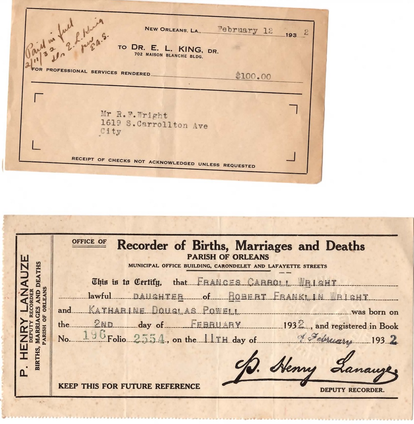 Buffy Welch's birth paperwork, (dr's bill) |