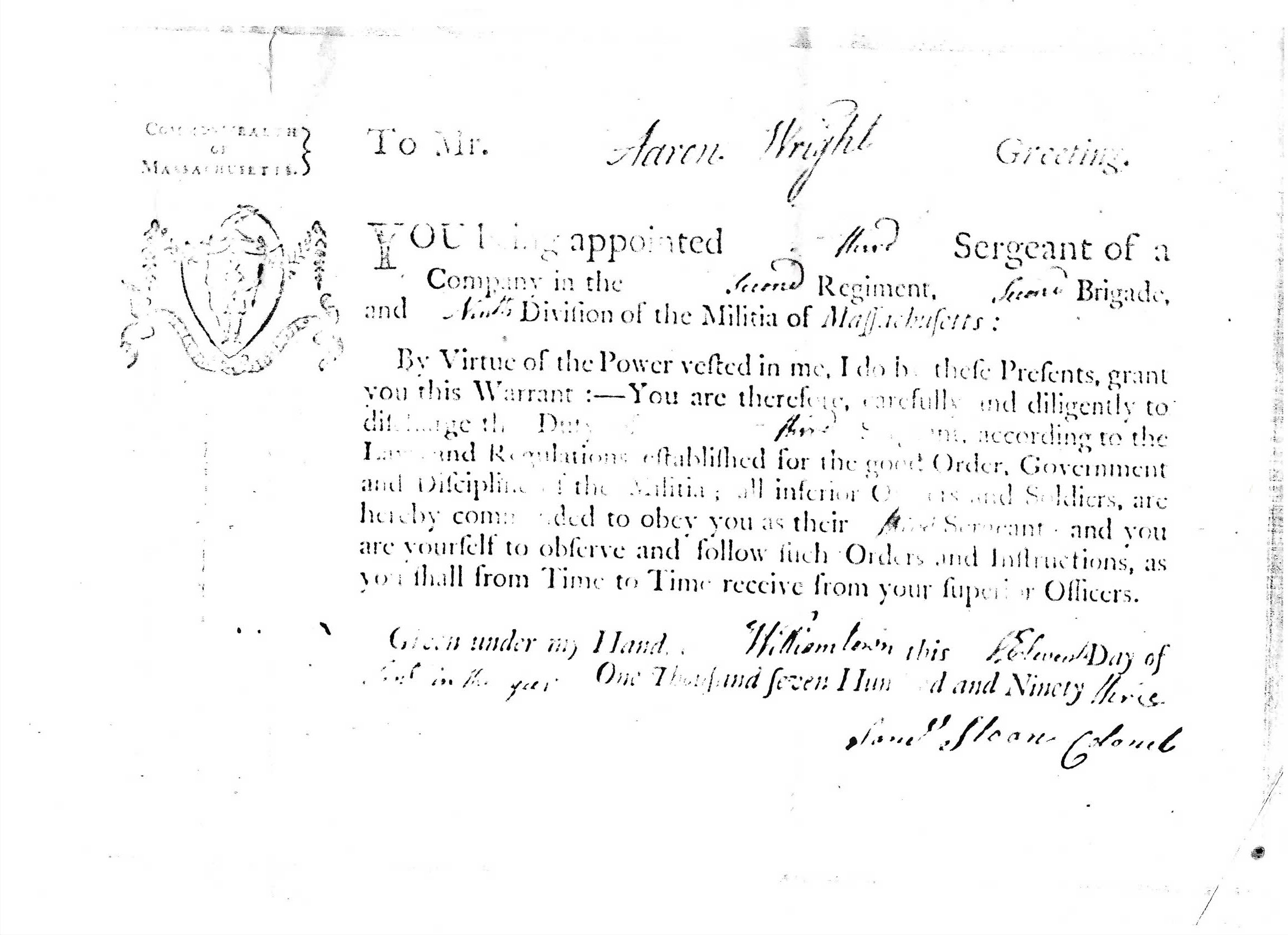 Aaron Wright induction into Millitia of Massachusetts (1793?) |